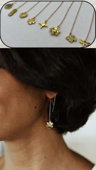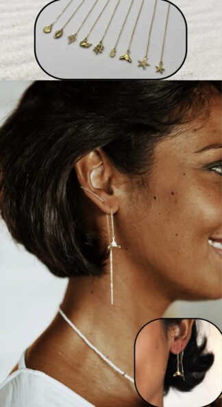 La boucle d’oreille s’enfile par le trou de l’oreille via la petite barre, et se tire plus ou moins selon votre convenance : vous pouvez ajuster la hauteur de la breloque : très proche du lobe d’oreille ou plus bas.